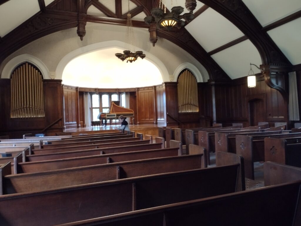 The acoustics in the Eliot Hall Chapel are ideal for early keyboard instruments and provided glorious sound for the afternoon sessions and evening recital. The Chapel is on an upper floor and served by an elevator too small for harpsichords, so the afternoon instrument was carried up the stairway by professional piano movers.